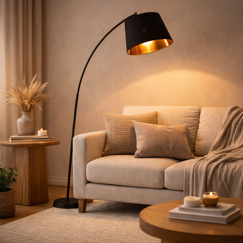 Lámpara de piso diseño moderno, elaborada en cuerpo y base de metal, color: negro con altura total de: 196 cms. Pantalla semicónica de cartón en tonalidad: negro (56).