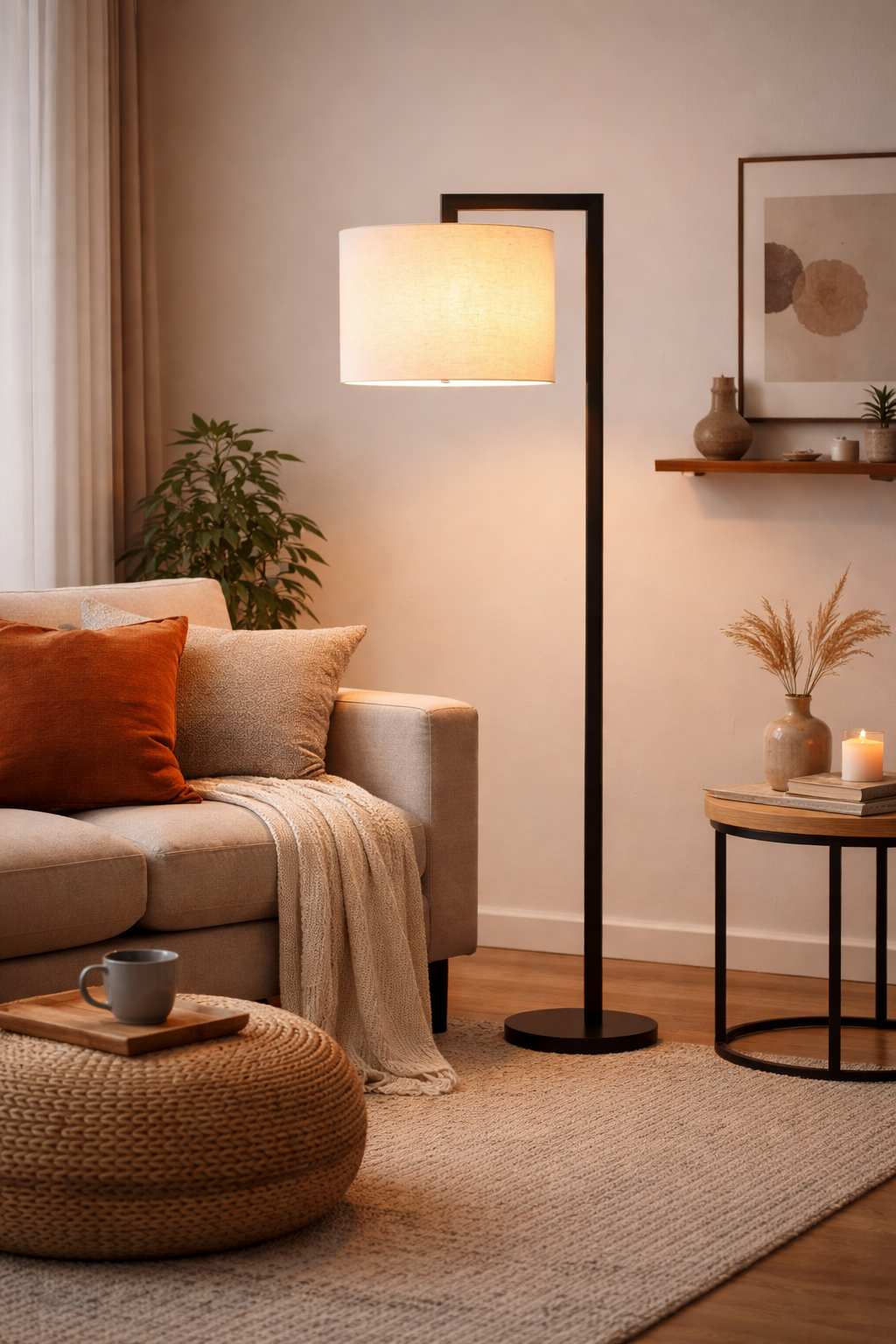 Lámpara de piso contemporánea, color negro. Base y poste central de metal con pintura horneada semi-mate. Pantalla cilíndrica de tela avena (40x40x30 cm). Interruptor en el cable. Para focos E26 (máx. 40W). Altura: 155 cm. 127V/60Hz.