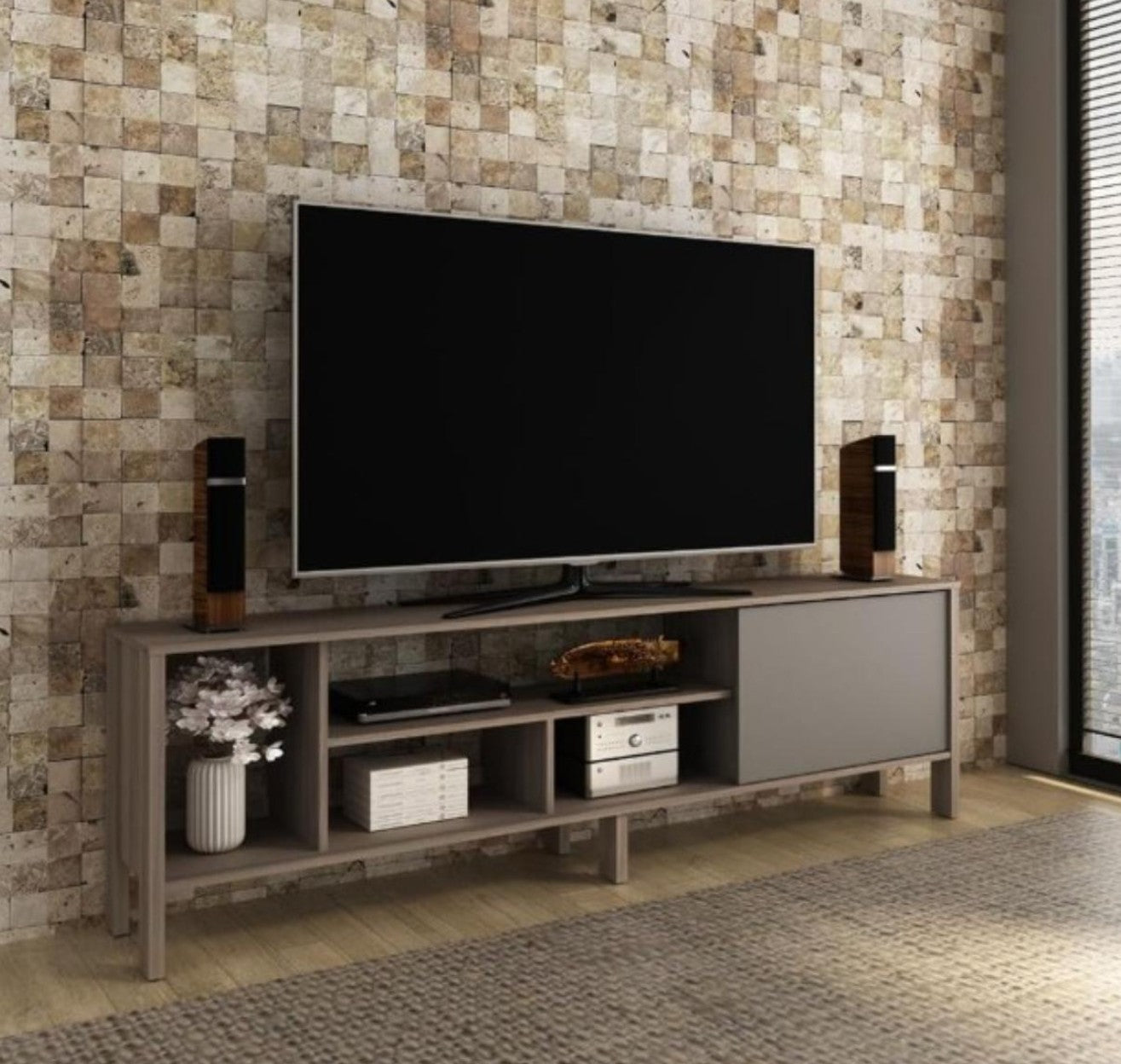 Rack para TV moderno, centro de entretenimiento con puertas abiertas (entrega en caja)